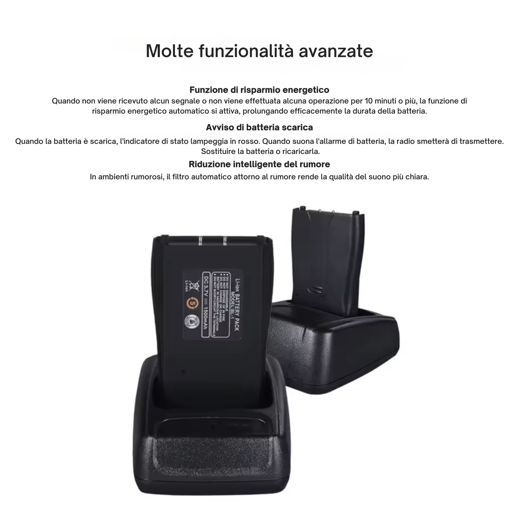 Compatto e leggero, il dispositivo offre una batteria ricaricabile a lunga durata per non rimanere mai senza comunicazione nei momenti importanti. Il suo design robusto garantisce durabilità anche in ambienti difficili.